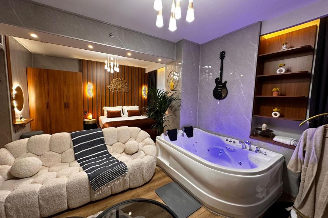 Food & DrinkTea/Coffee maker, Bottle of waterBathroomBathtub or shower, Bathtub, Hairdryer, Toilet, Spa tub, Bathrobe, Private bathroom, Slippers, Conditioner, Free toiletries, Towels, Toothbrush, Toilet paper, Shampoo, Body soap, ShowerMedia & TechnologyFlat-screen TV, Cable channels, Streaming service (like Netflix), Satellite channels, Radio, TVGeneralCarbon monoxide detector, Air conditioning, Fire extinguisher, Hardwood or parquet floors, Ironing facilities, Key access, Heating, Hypoallergenic, Soundproof, Smoke Alarm, Key card access, Iron, Trash cansActivitiesHot tubKitchenWine glasses, Cleaning products, Kitchenware, Electric kettle, Refrigerator, KitchenetteLiving AreaDining area, Sitting area, Sofa, DeskServicesWake-up serviceBedroomLinens, Wardrobe or closetViewCity view, Mountain viewRoom AmenitiesSofa bed, Socket near the bed, Non-feather pillow, Clothes rackSafety featuresAir purifiers |