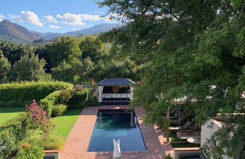 Owned by 2 leading designers, this stunning private home with four separate suites, large gardens and secluded swimming pool, is located on a quiet residentialstreetinthe centreof Franschhoek and is within twominutes walking distance of the villagecentre and it's award winning restaurants, galleries and shops.