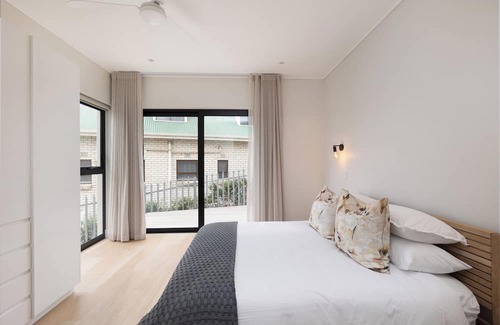 Bedroom 1 (Master 1) – king bed, full en-suite bathroom, heated towel rails, built-in cupboards, air-conditioning, ceiling fan, doors opening onto patio